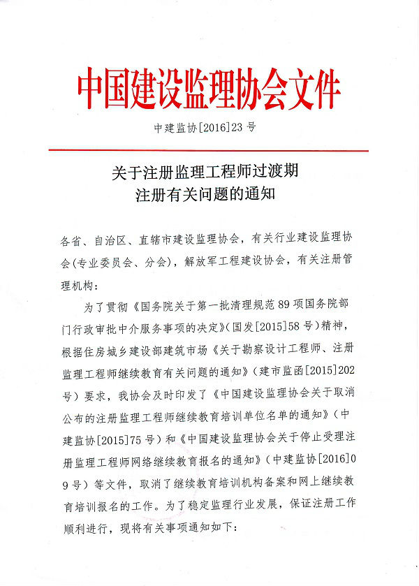 關(guān)于注冊監(jiān)理工程師過渡期注冊有關(guān)問題的通知
